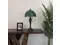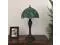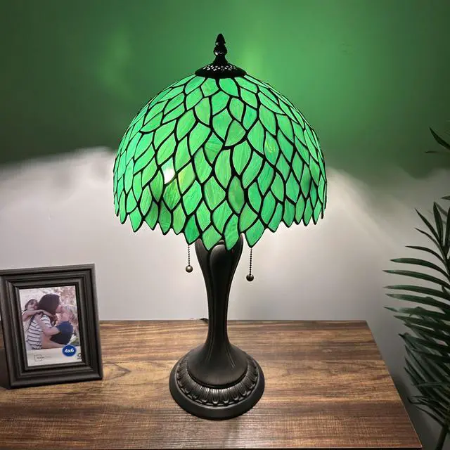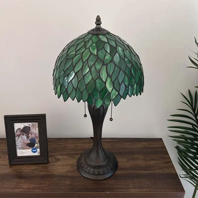 12"W*12"D*22"H. Stained glass shade. Resin base with bronze finish. Pull Chain switches, LED Bulbs Included, UL listed. Each piece of stained glass is hand-soldered into place using the traditional copper foil technique.