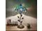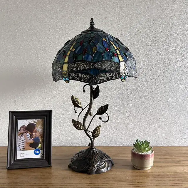12"W*12"D*22"H. Stained glass shade. Metal and resin base with bronze finish. Pull Chain switch, LED Bulb Included, UL listed. Each piece of stained glass is hand-soldered into place using the traditional copper foil technique.