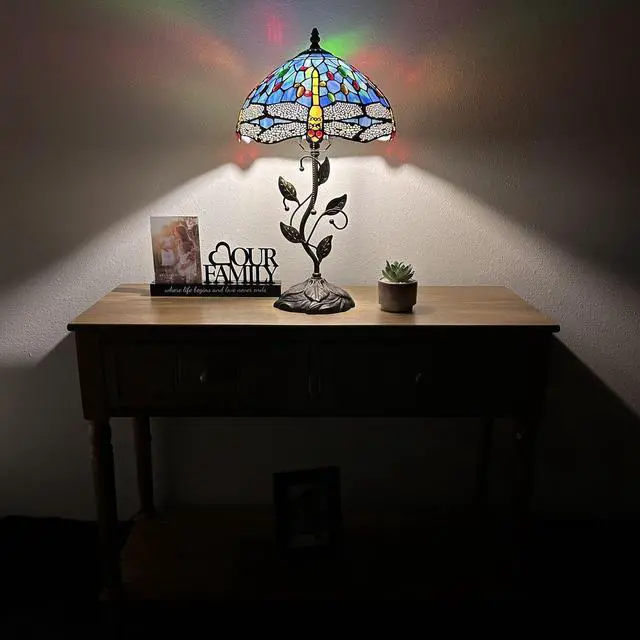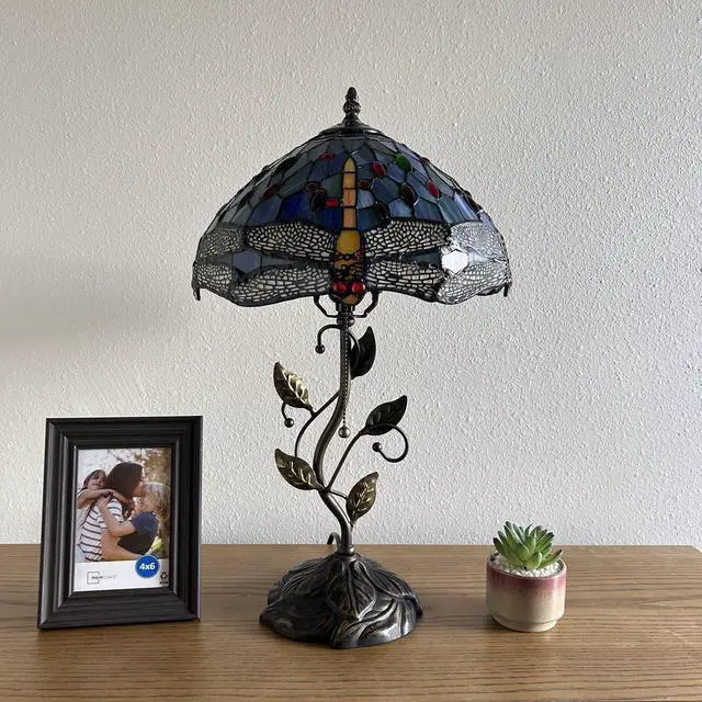 ENJOY DECOR LAMPS Tiffany Style Table Lamp Blue Stained Glass Dragonfly Included LED Bulb for Living Room Bedroom Bedside 12"W*12"D*22"H