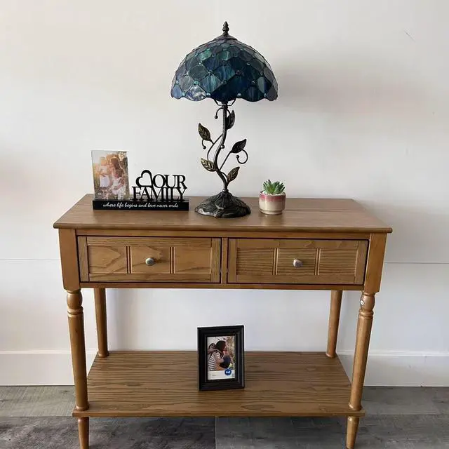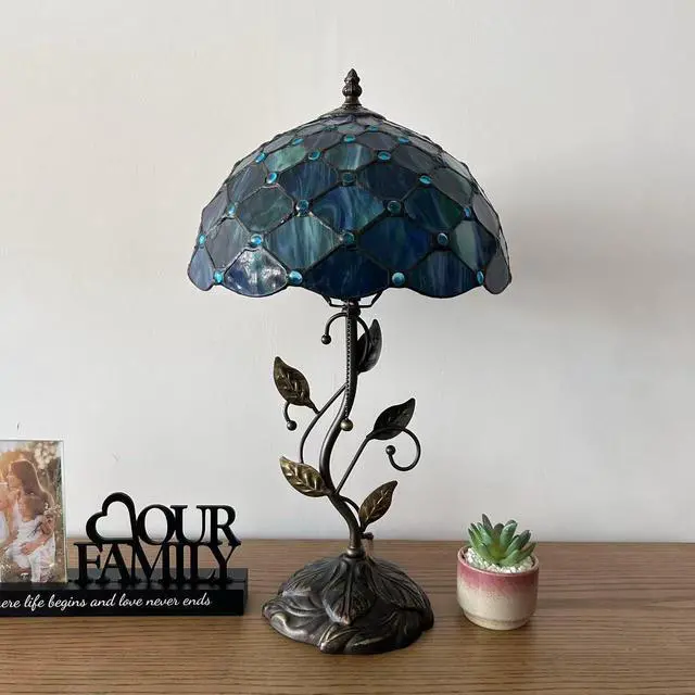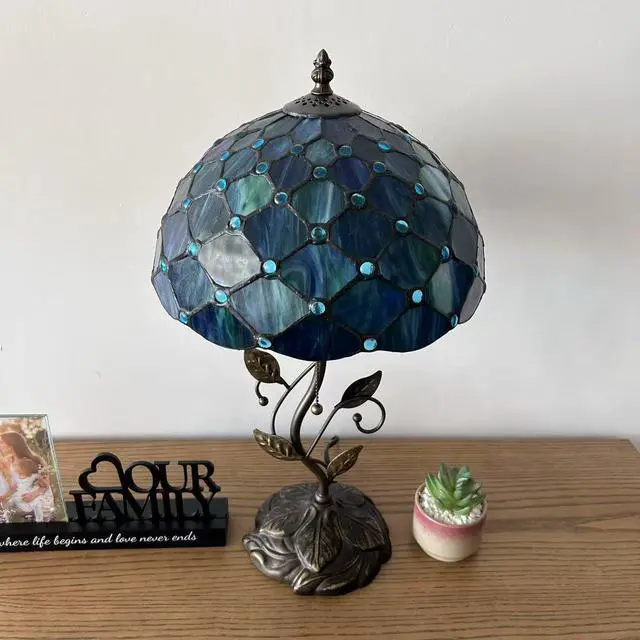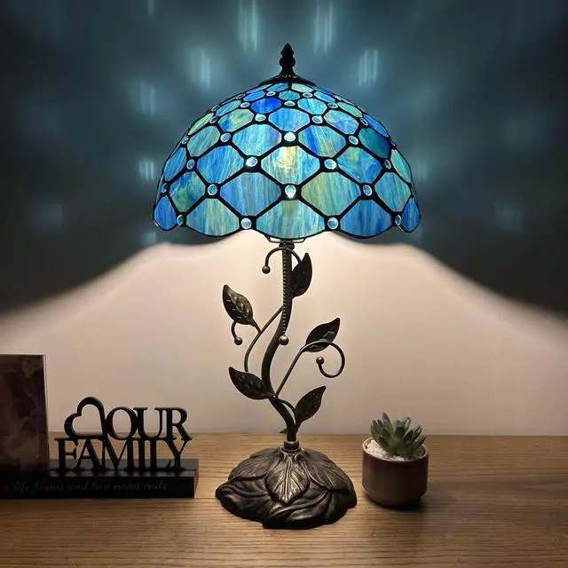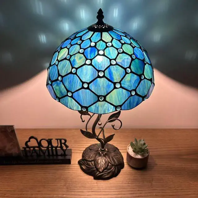 ENJOY DECOR LAMPS Tiffany Style Table Lamp Blue Green Stained Glass Crystal Beans Included LED Bulb for Living Room Bedroom Bedside 12"W*12"D*22"H