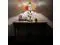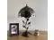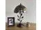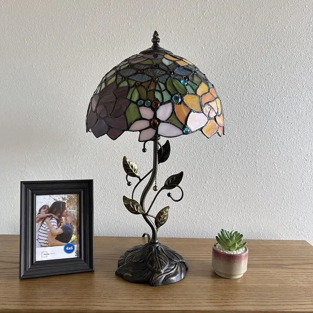 12"W*12"D*22"H. Stained glass shade. Metal and resin base with bronze finish. Pull Chain switch, LED Bulb Included, UL listed. Each piece of stained glass is hand-soldered into place using the traditional copper foil technique.
