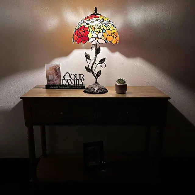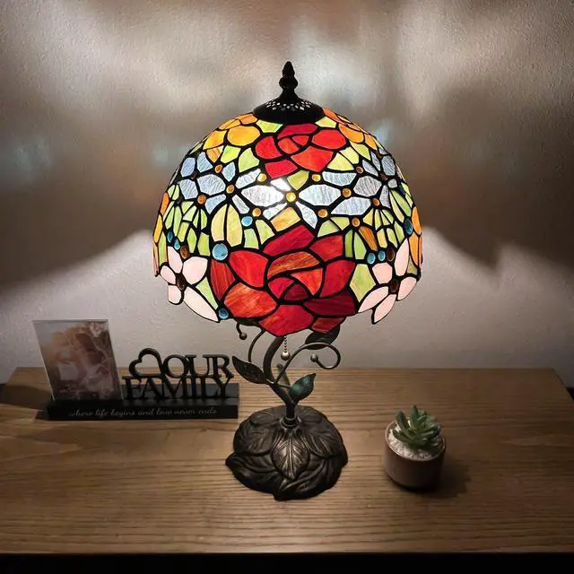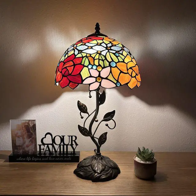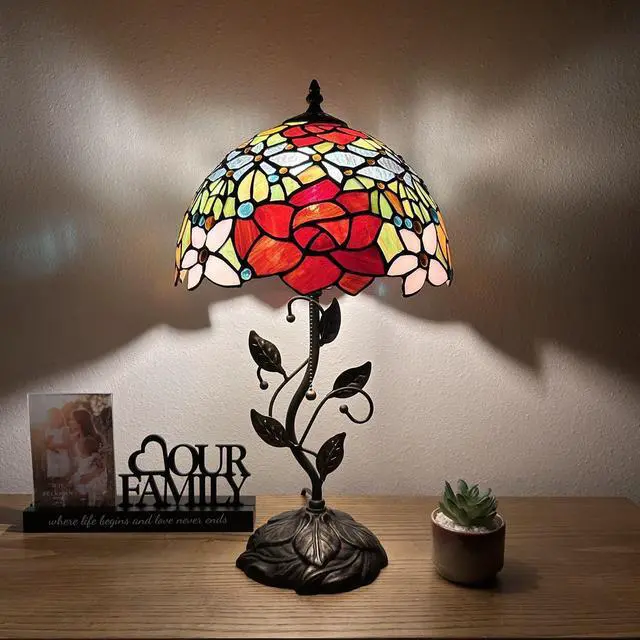 ENJOY DECOR LAMPS Tiffany Style Table Lamp Red Orange Blue Stained Glass Rose Flowers Included LED Bulb for Living Room Bedroom Bedside 12"W*12"D*22"H