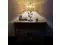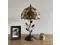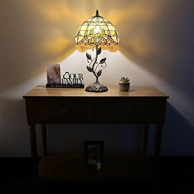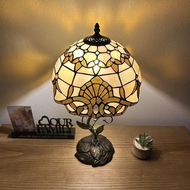 12"W*12"D*22"H. Stained glass shade. Metal and resin base with bronze finish. Pull Chain switch, LED Bulb Included, UL listed. Each piece of stained glass is hand-soldered into place using the traditional copper foil technique.