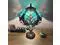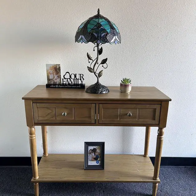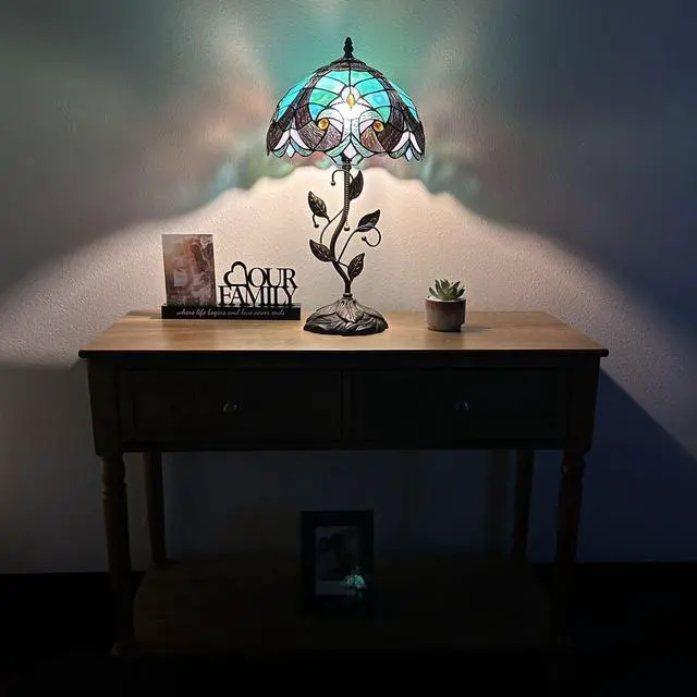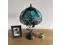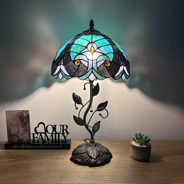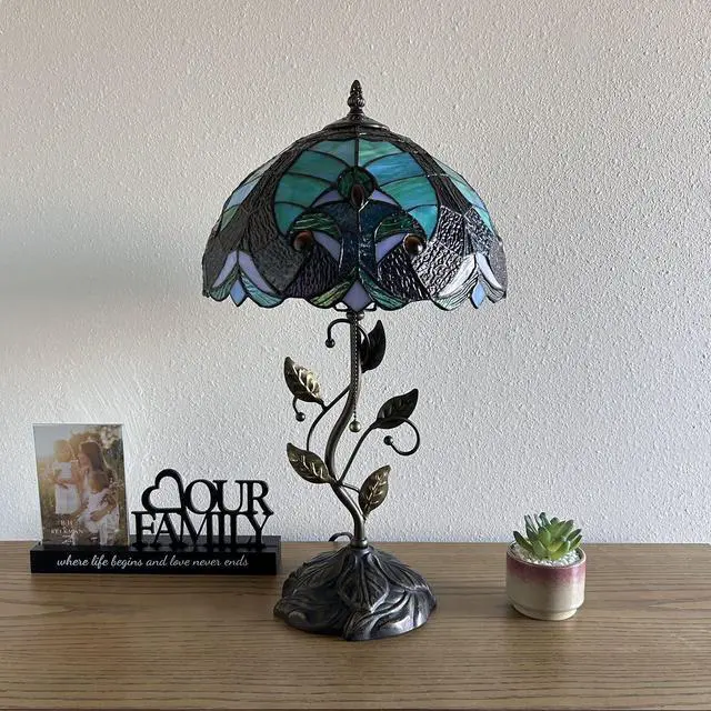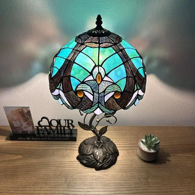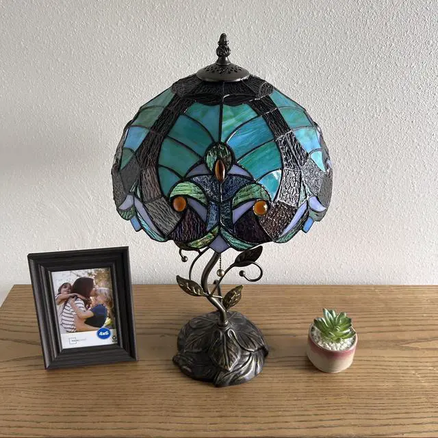 12"W*12"D*22"H. Stained glass shade. Metal and resin base with bronze finish. Pull Chain switch, LED Bulb Included, UL listed. Each piece of stained glass is hand-soldered into place using the traditional copper foil technique.