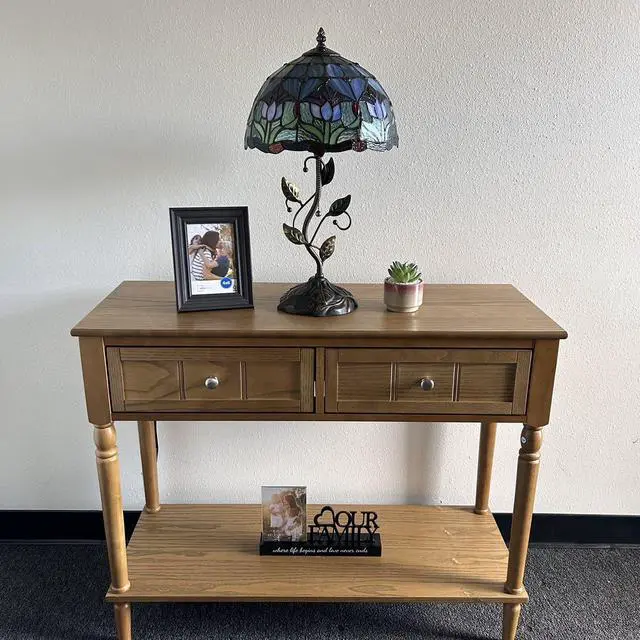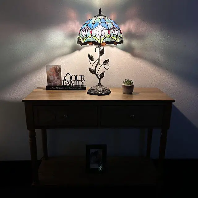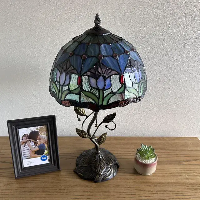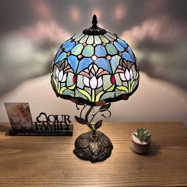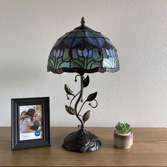 ENJOY DECOR LAMPS Tiffany Style Table Lamp Blue Purple Stained Glass Tulips Included LED Bulb for Living Room Bedroom Bedside 12"W*12"D*22"H