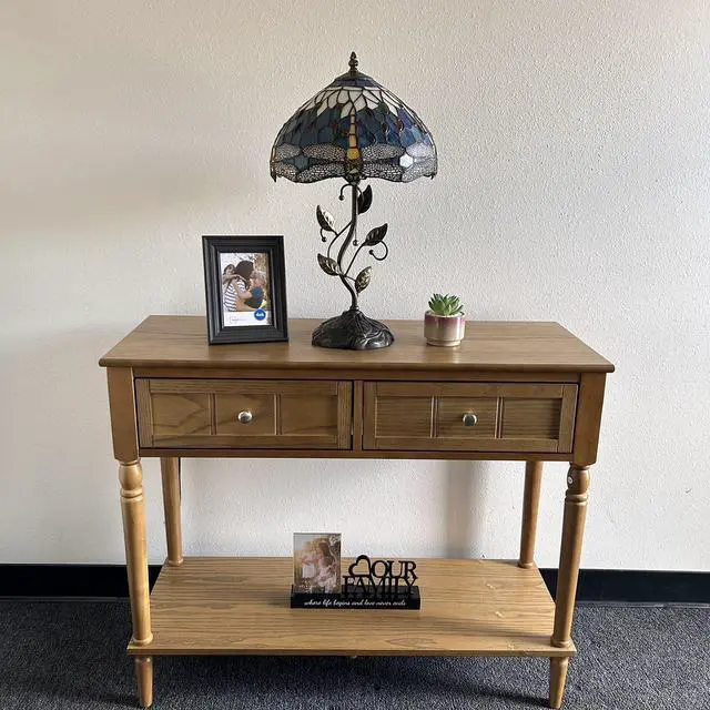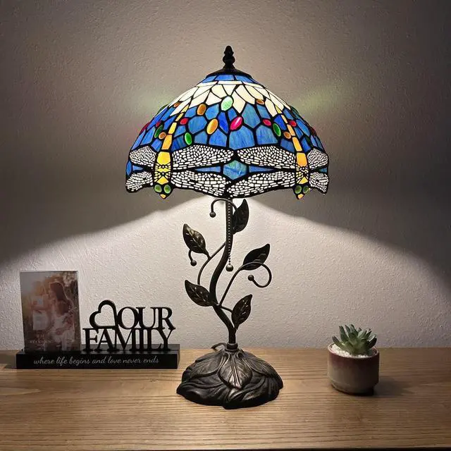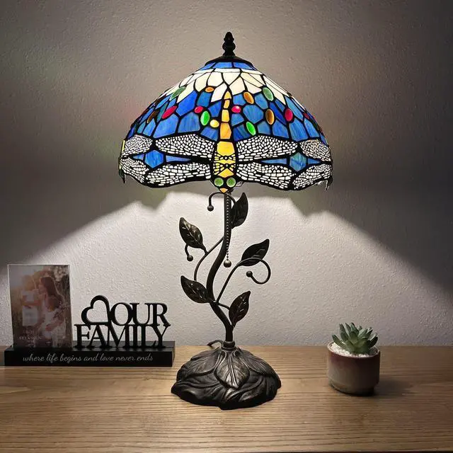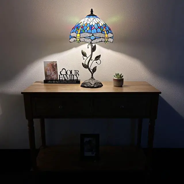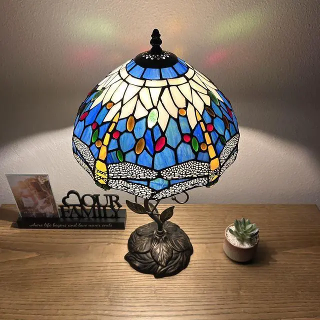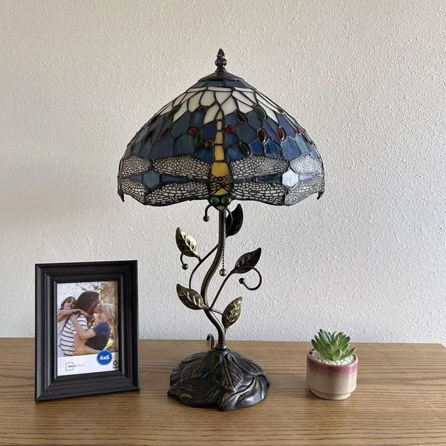 ENJOY DECOR LAMPS Tiffany Style Table Lamp Blue Stained Glass Dragonfly Included LED Bulb for Living Room Bedroom Bedside 12"W*12"D*22"H