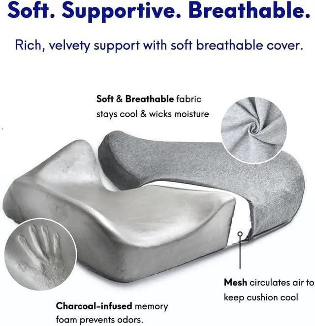 ZERO PRESSURE SUPPORT proprietary extra-dense charcoal memory foam offers soft and velvety support while remaining odor-free in usage. WORK FROM HOME IN TOTAL COMFORT TODAY enjoy back & hip relief while working from home on any chair. If not satisfied, hassle-free full refund. DRIVER TESTED, TUSH APPROVED take the weight off your tailbone and lower back during long drives or road trips. Great for wheelchair and mobility scooter relief.