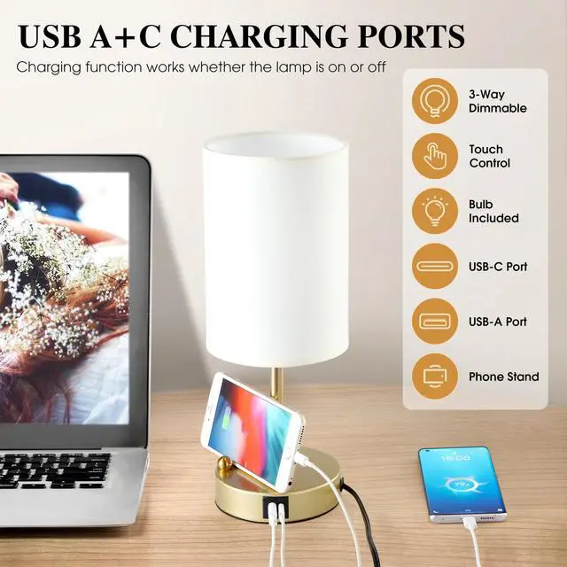 Touch Lamp with USB C+A Charging Ports
