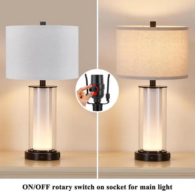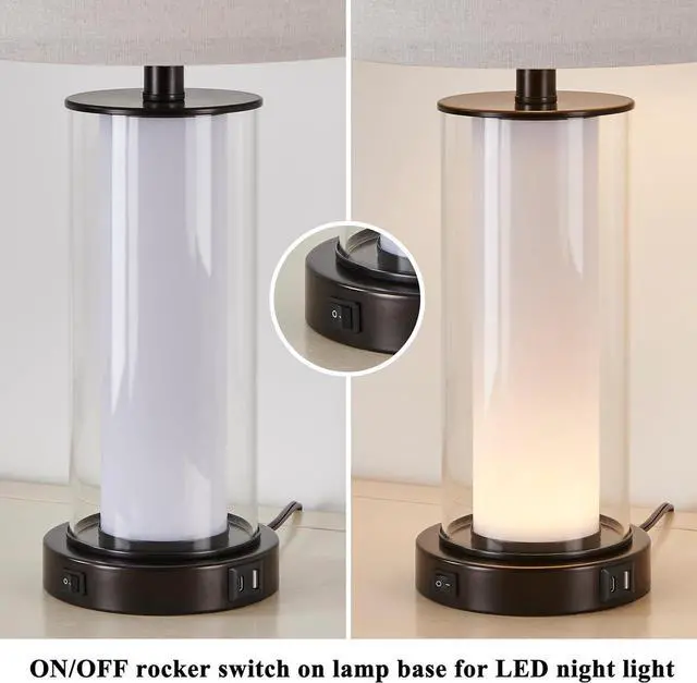 Dual Light Control: The main light is controlled by a rotary switch on the socket while the night light is controlled by a rocker on/off switch on the front of the base, providing versatile lighting options for your table lamp for bedroom.