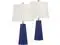 Pre-Assembled ShadesDeep blue finish. Triangle patterned textured ceramic construction. Brushed nickel finish metal accents. White fabric tapered shades. 8-foot long cords.