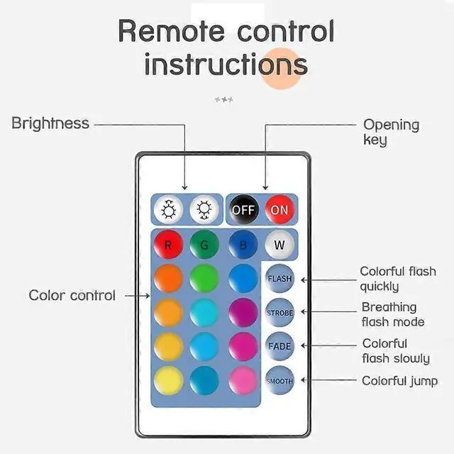 Remote control with 9 color options, adjustable brightness, and sleep timer