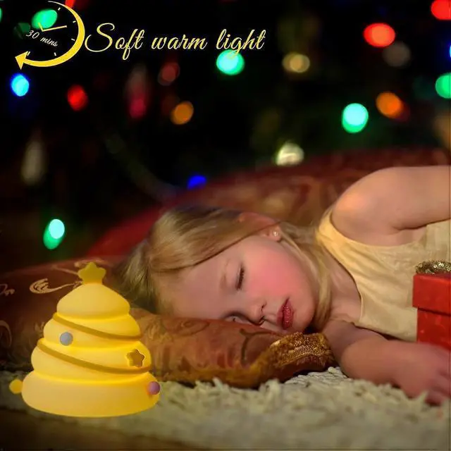 Christmas Tree Design**: Features a charming mini Christmas tree wrapped with light ribbons, star lights, and round lights, creating a cozy holiday atmosphere perfect for nurseries and bedrooms.
