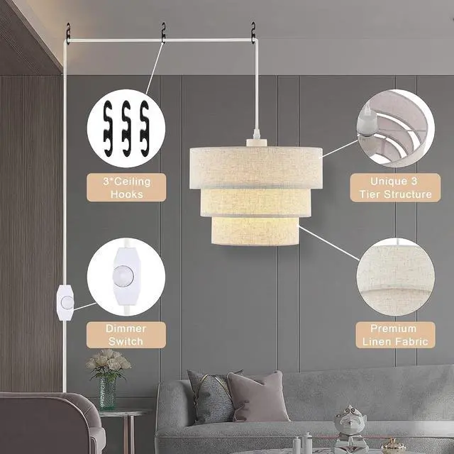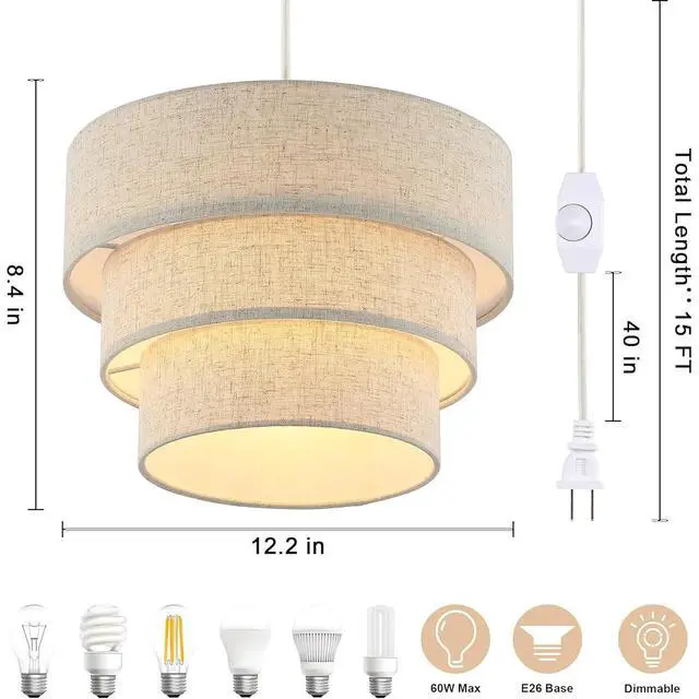 & - This plug in pendant light is designed with three layers of circular lampshades of different sizes, which is more layered and artistic than ordinary single-layer lampshades. The premium fabric lampshades can soften the light and provide comfortable light to reduce eye strain and protect your eyes.