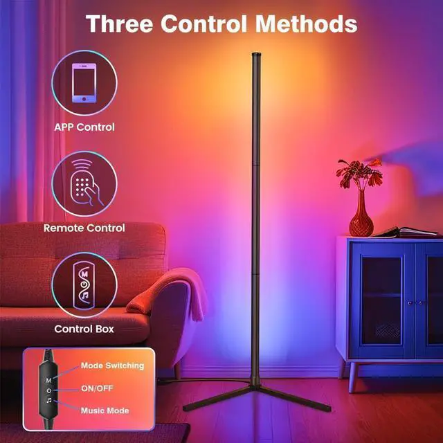 Remote controls, app controls and wire switches make it easy to control the corner floor lamp. The app allows you to adjust the color, brightness and lighting effects to your liking.
