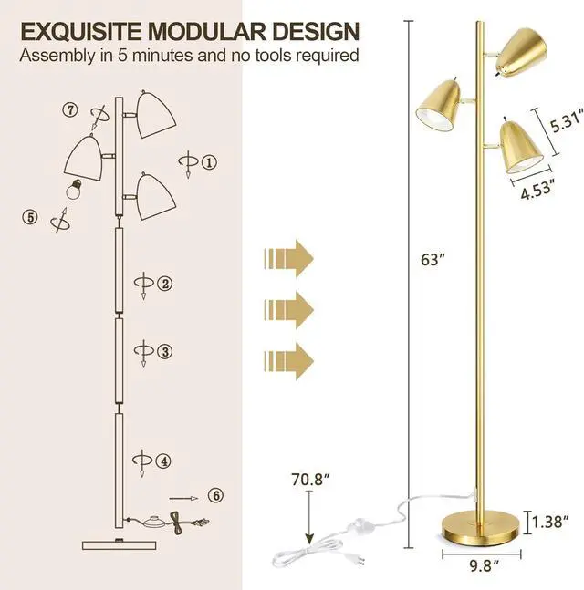 3 separate rotate switches: our standing lamp is convenient to use. Considering the usage habit of daily life, we put a separate rotate switch on each top of the lampshade, you could turn on/off the single light you need, you get the brightest if turn on 3 lights.