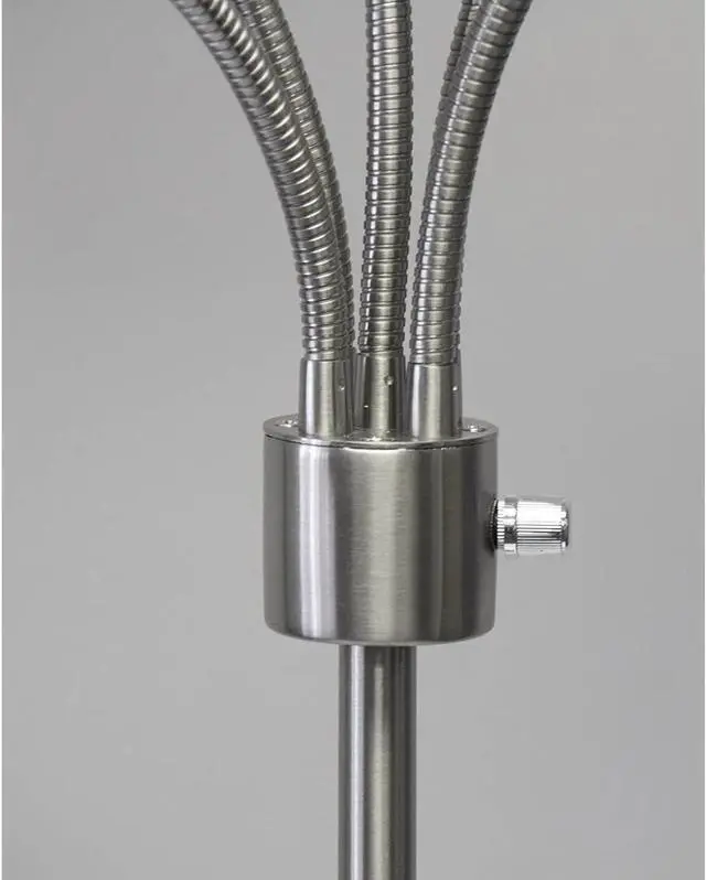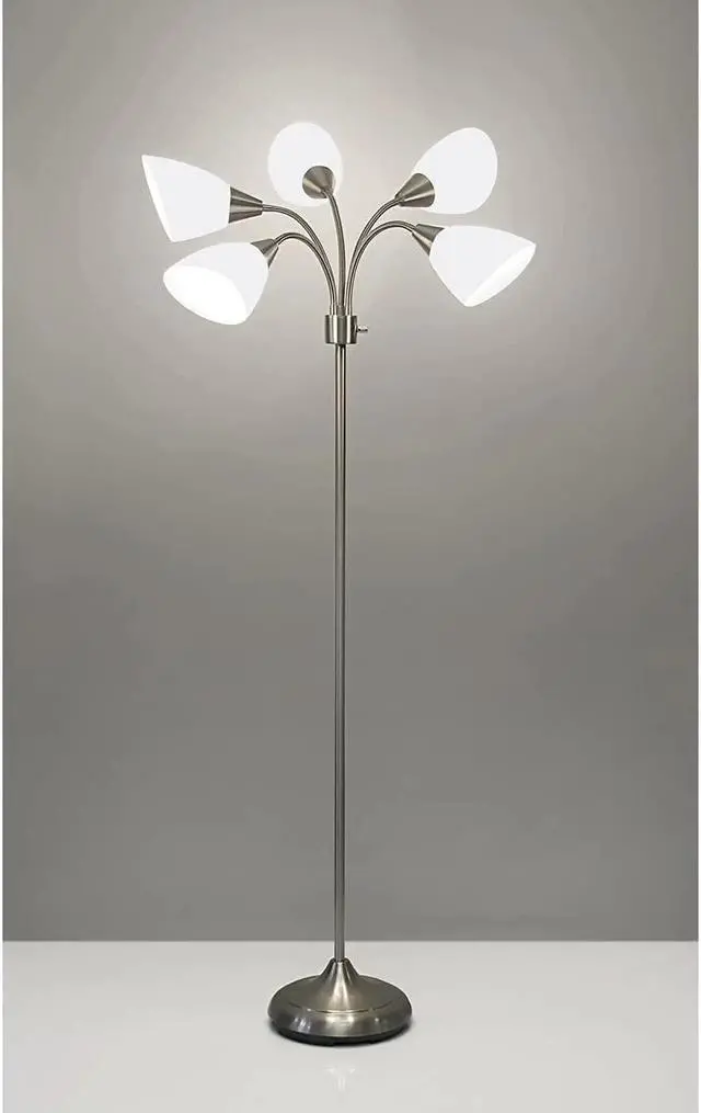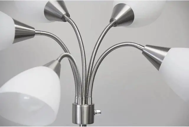 MODERN SLEEK DESIGN With a sleek brushed steel finish and five modular white frosted acrylic shades this lamp adds modern, clean, minimalist look to any room.