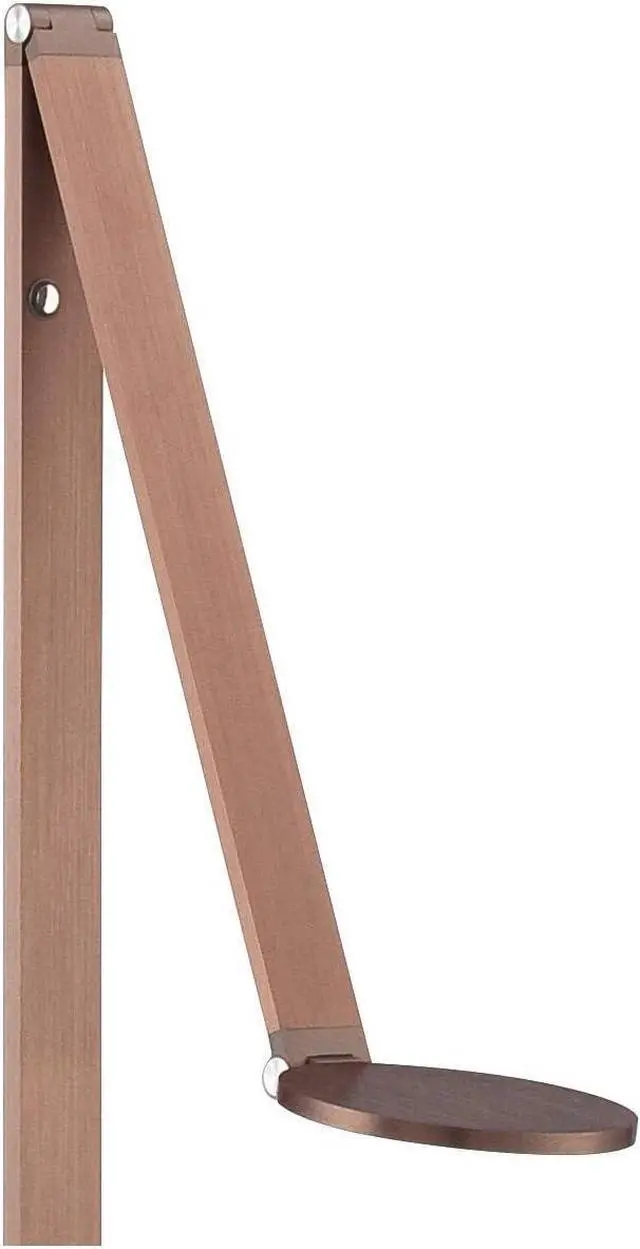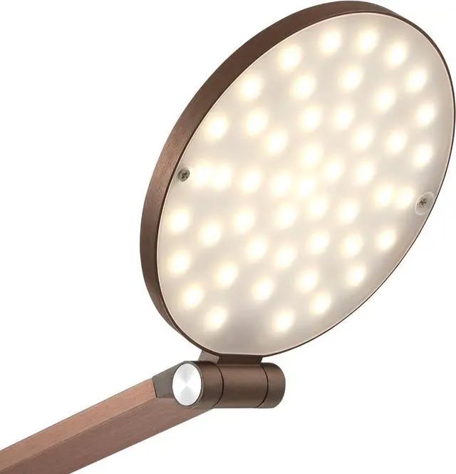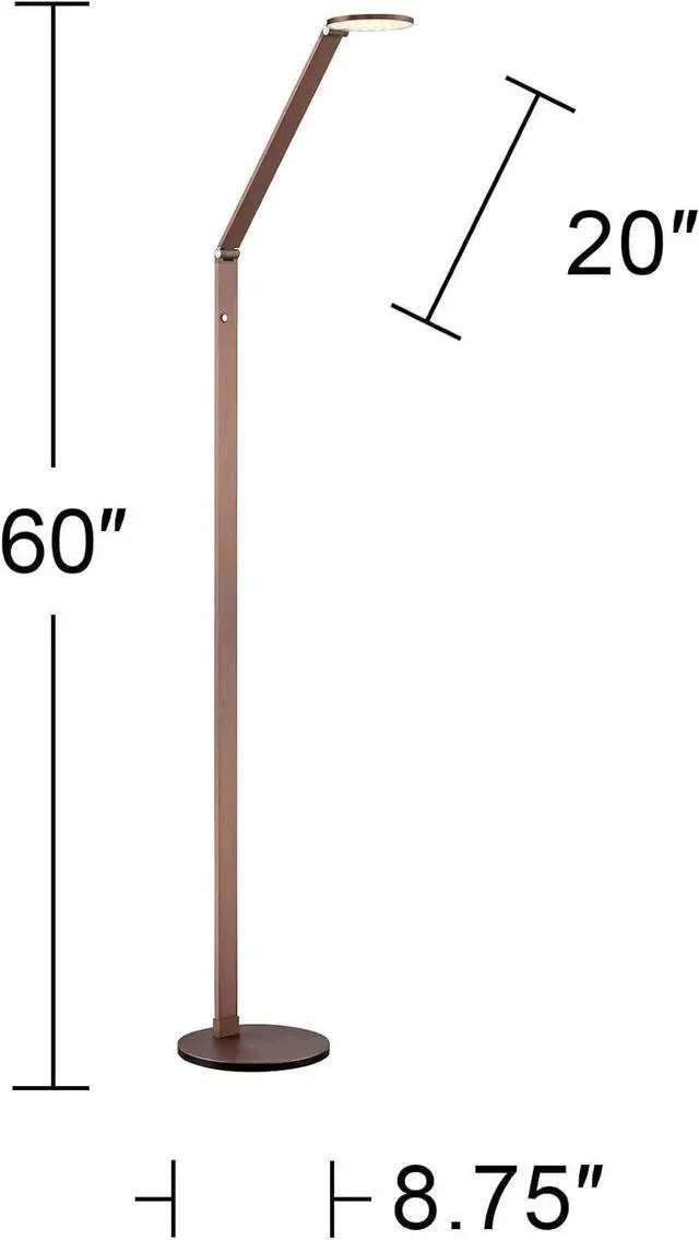 61" high in full upright position with head at 90-degrees. 46" main column plus 15" arm. Lamp head is 5" wide. Base is 8 3/4" wide. Built-in 10 watt LED is comparable to a 60 watt incandescent. 800 lumens. 3000K. Built-in dimmer switch on the column gives you easy lighting control.