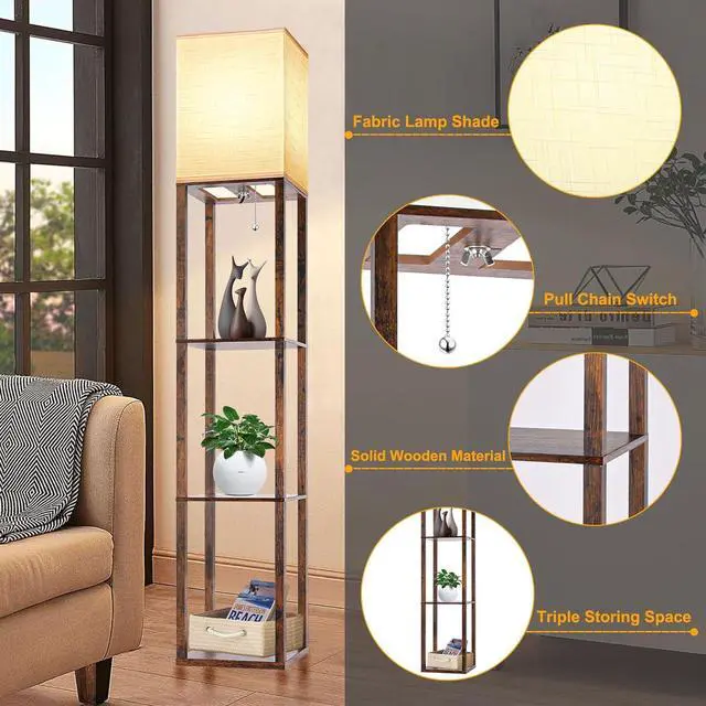 • 3 tier storage and display: Our floor lamp with shelves is made of sturdy wood with stable structure, high loading with 50 lbs max loading capacity, which loads 50 lbs max. This floor lamp adds ambiance to your room and provides a storage or display area for vases, books, plants, albums or other items.