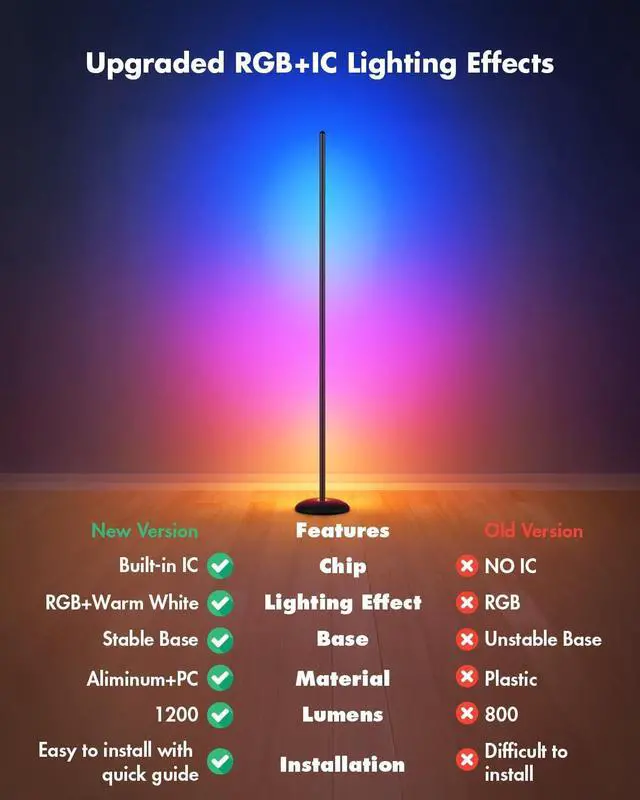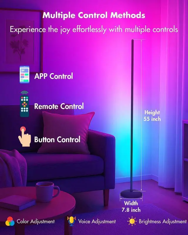 Advanced RGB+IC Color Technology: Our corner floor lamp is equipped with cutting-edge RGB+IC technology and high-quality built-in LEDs. Enjoy stunning color accuracy and a 30% brightness boost over traditional lamps. Create the perfect ambiance with a wide range of vibrant colors, perfect for any occasionwhether it' s Christmas decorations or adding a modern touch to your living space.