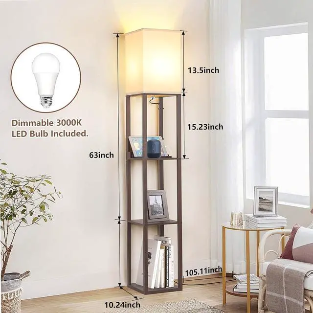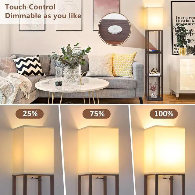 3-Way Dimmable Touch Control: The most personalized part of this shelf floor lamp for the living room is the 3-way(soft, natural, High) dimmable touch control function. Just tapping the button, this night-standing lamp can meet all your needs, no matter the nursery, nightlight, or reading. With the most common E26 base (MAX 100w and 120V) and 3000K dimmable bulb, this floor lamp is Not compatible with smart bulbsvoice control or wall light switch.