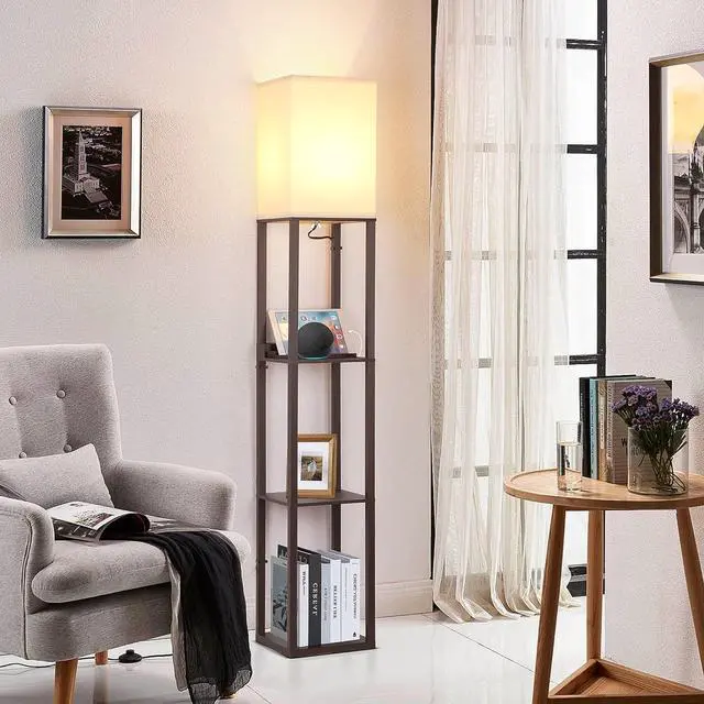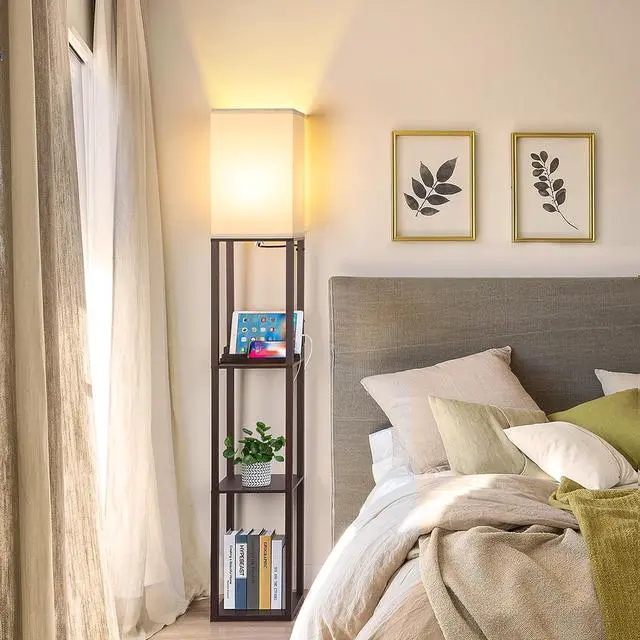 Shelf Floor Lamp: Tender TC cloth light shade and sturdy wooden frame collision the fashion sparks, this design complements any room decoration, like modern, rural, farmhouse and so on. This shelf floor lamp is a unique combination with the storage shelf, charge station, and led floor lamp.
