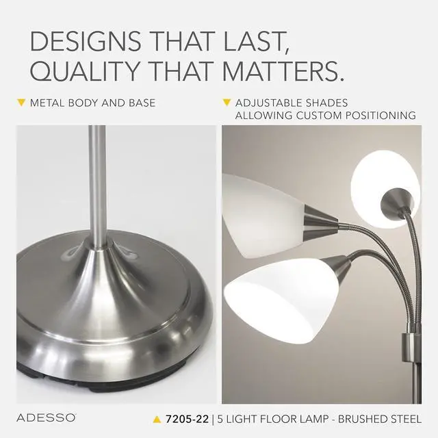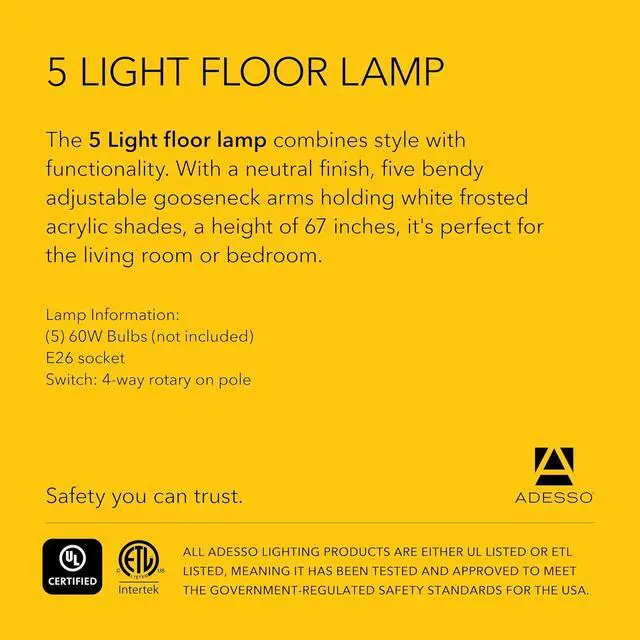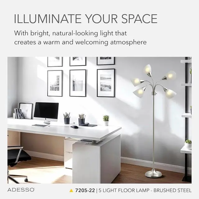 Customizable Positioning Featuring 5 movable shades with bendy gooseneck arms, this arc floor lamp directs light where needed. Ideal lighting for content creators, workspaces, and dorms, it provides targeted light for any room or task.