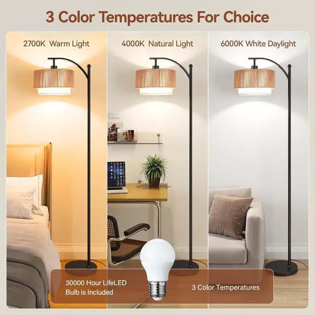 Color Temperature LED Bulbs Included: SUNMORY farmhouse Floor Lamp includes a 12 watt, 1200 lumen, LED E26 bulb. This arc floor lamps bulb has 3 color temperatures that can be adjusted: 2700K - 4000K - 6000K. You only need to press the foot switch to switch the arched floor lamp to different color temperatures, freeing your hands, black floor lamp can create different atmospheres for you. This floor lamp is perfect as a reading lamp, office lamp, or lamp for living room