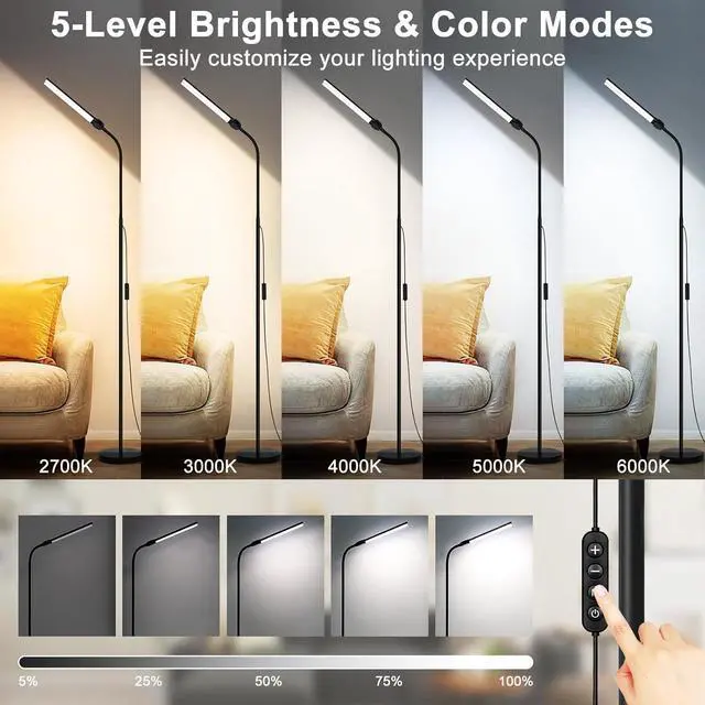 5 Level Brightness & Color Temperatures: With the inline switch on the floor lamp for bedroom, you can effortlessly adjust the brightness from 5% to 100% and fine-tune the color temperature from 2700K to 6000K. The different level settings are designed to fully cater to all your daily lighting requirements.
