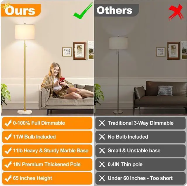 1000-Lumen 11W Bulb Included: Our gold floor lamp comes with an E26 base bulb (2700K warm white) with a lifespan of 25, 000 hours, saving up to 90% energy. The reading floor lamp is also high brightness up to 1000 lumen, making it perfect for reading and studying while protecting your eyes from flickering light. It is also compatible with other E26 base bulbs, as long as the wattage is below 60W