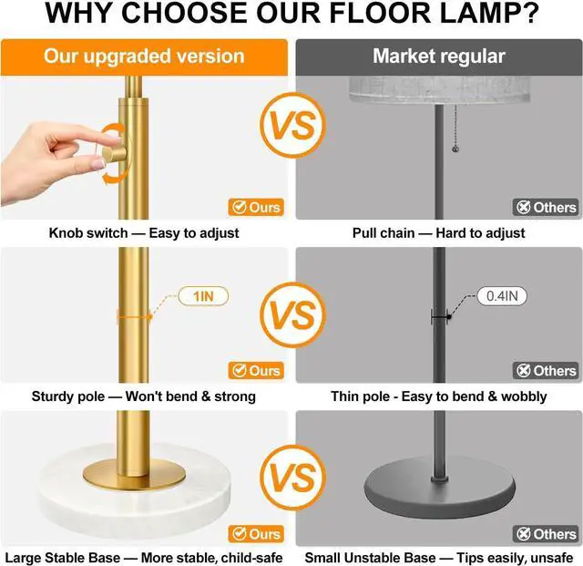 Stable Marble Base & Space-Saving Design: Our standing lamp features a high-quality marble base for added stability, preventing tipping and ensuring the safety of children and pets. Its space-saving design allows you to place it in any corner or next to furniture like an end table, bedside table, office desk, nightstand or sofa