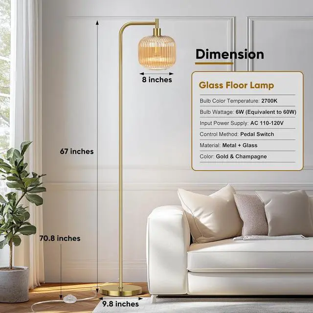 Elegant design: the standing lamp adopts a long and slender painted tubular metal lamp pole matched with a champagne ribbed glass lampshade to make the tall floor lamp look stylish and delicate. The soft warm light creates a comfortable atmosphere. Compatible with various decorative styles such as New Nordic, mid-century, modern, classic, and artistic decoration. Bring different lighting experiences to your different styles of space