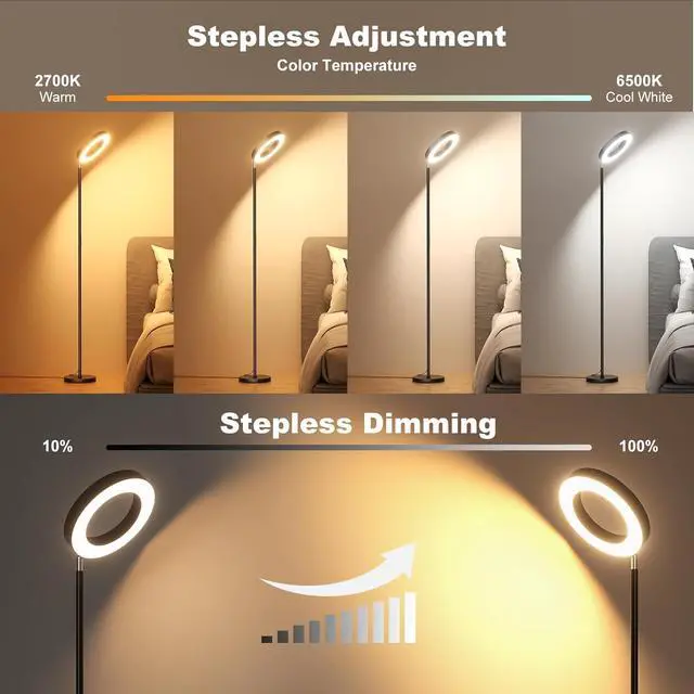 Stepless Dimming: This dimmable floor lamp offers continuous brightness adjustment (5%-100%) and color temperature adjustment (2700K-6500K), providing personalized lighting tailored to your needs