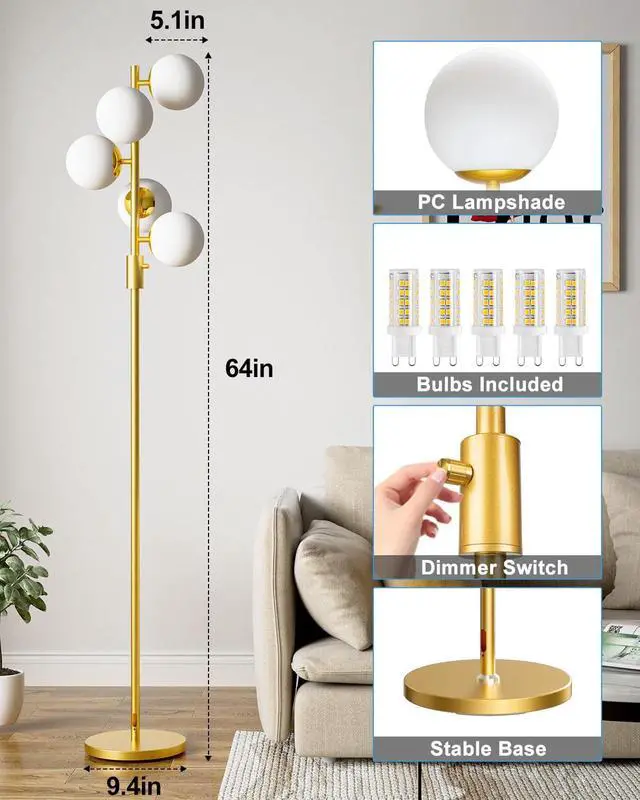 5PCS G9 Bulbs Included | Eye-Friendly Illumination This cute floor lamp features This standing lamp comes with 5PCS 3000K warm white G9 bulbs that do not overheat or flicker. The frosted PC shades ensure soft and non dazzling lighting, making it perfect for working, reading and daily use.