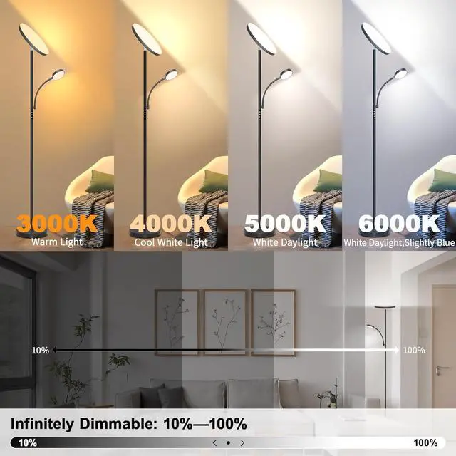 4 Color Temperatures & Dimmable Floor Lamp: Our standing lamp features stepless dimming (5%100%) and color temperatures from 3000K to 6000K. Use the remote to easily switch between reading/work, relaxation, and nightlight modesideal for all your daily needs. This tall floor lamp works perfectly in bedrooms, living rooms, or offices. It also has a memory function that saves your last lighting settings for added convenience.
