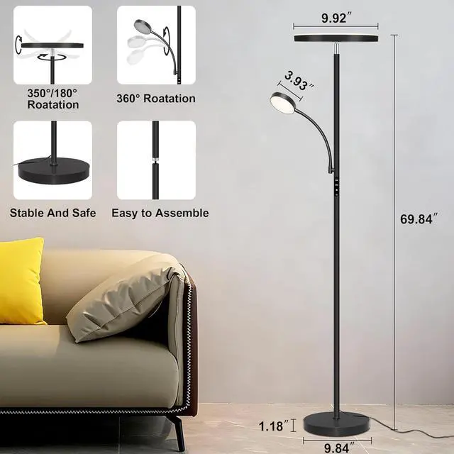 Super Bright LED Floor Lamp: This bright floor lamp comes with a main light (rotates up to 350° and tilts 180° up and down) and a reading light (bends 360°)its glare-free and bright enough to light up your living room. The adjustable reading light lets you angle it perfectly, whether youre reading, working, or just relaxing.