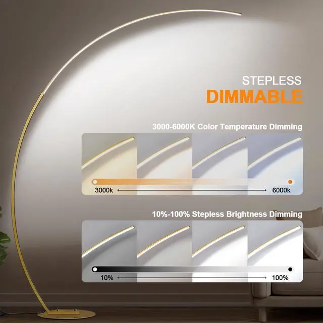 4 Dimming Modes & Eye ProtectionThis stepless dimmable 0-100% LED floor lamp with remote control allows you to customize the brightness and color temperature (3000-6000K). The 4 modes can be used for reading, working, mood setting, or sleeping, greatly enhancing your lighting experience. The soft and flicker-free lights are not glaring or dazzling, providing a cozy and safe experience for extended reading or Leisure Time.