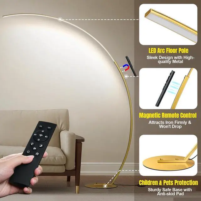 Modern & Elegant DesignWith the modern minimalist design concept, our unique arc floor lamp features smooth and simple curved lines. It does not take up space and can be placed anywhere, making it your ideal home decoration. It can easily match various styles of living room, bedroom, and office room. Additionally, its weighted metal base and sturdy design ensure that it will not be tipped over by pets.