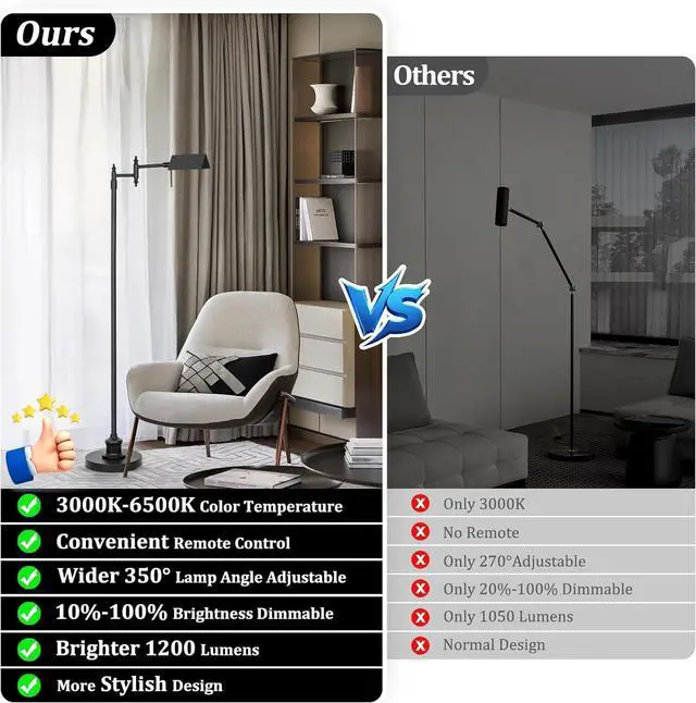 Stepless Color Temperature & BrightnessOur upgraded dimmable floor lamp enables you to completely control the lighting with seamless stepless dimming (10%-100% brightness) and adjustable color temperature (3000K-6500K). Unlike 3000K 3-way dimmable pharmacy floor lamps on the market, you can customize every level of warmth and intensity to match various tasks. Whether it' s relaxed evenings, focused work, or a creative event, our modern task floor lamp with remote will always do its job well.