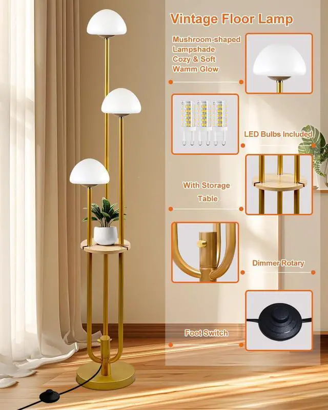 Unique & Exquisite Design: The 3 lights gold floor lamp measures 63IN high. 3 mushroom lampshades are scattered on 3 candle holder style metal pole, combined with elegant and minimalist metal structure, which can perfectly match industrail, farmhouse, modern home decor styles