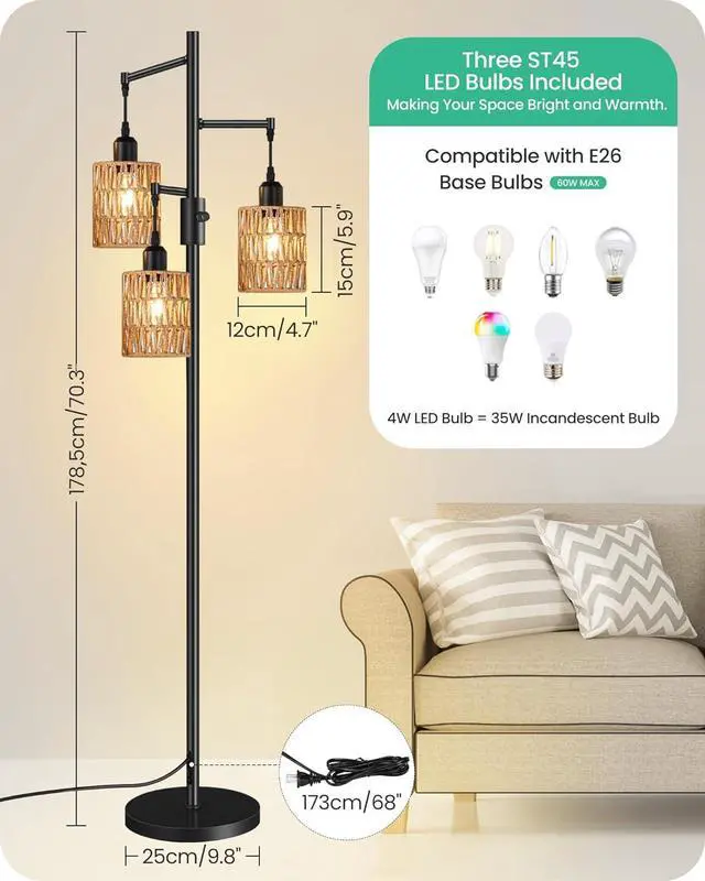 3 Dimmable Bulbs: This standing lamp includes three 4W ST45 LED bulbs that emit 400LM, effectively brightening your space while saving energy. The 2700K warm white light creates a quiet atmosphere that evokes the warmth of afternoon sunshine. You can personalize the lighting by using other E26 dimmable bulbs