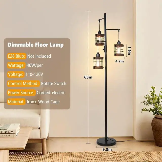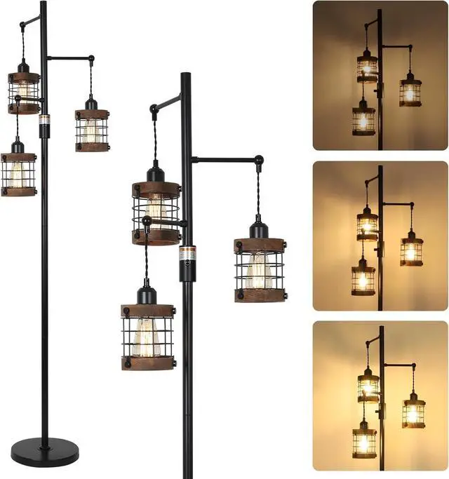 Farmhouse Style & Unique DesignThe 3 lights hang on the metal branches of the industrial floor lamp for bedroom, which can increase the lighting range of the living room. 65" tall floor lamp combines three cage lampshades with a black metal lamp pole, showing a blend of farmhouse and vintage styles that perfectly matches any decor in your home. Ideal floor lamps for living room, bedroom, office, study, bar, club, restaurant, etc.
