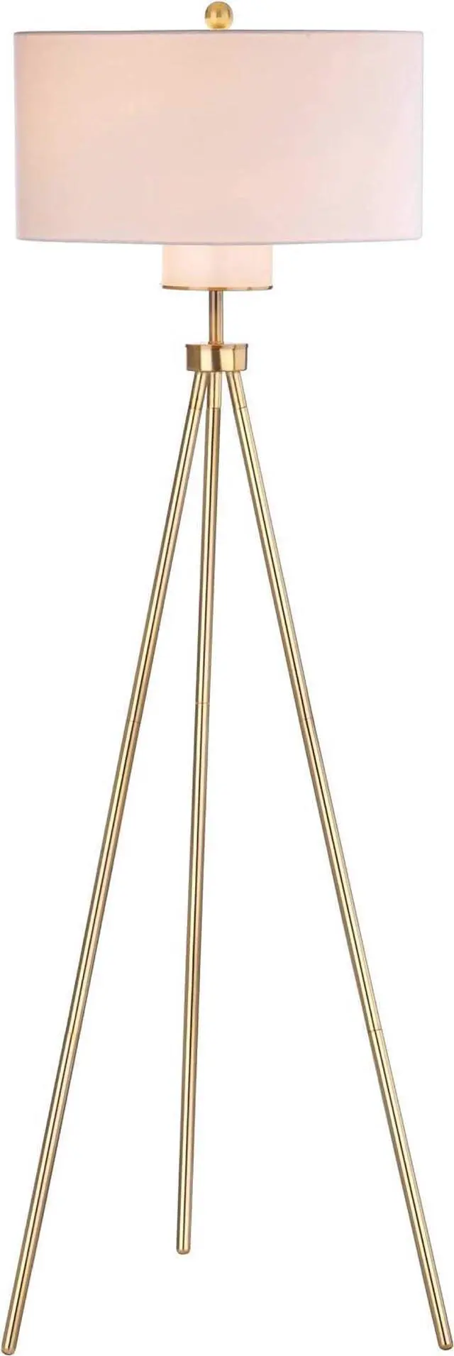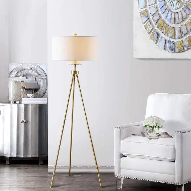 [STYLISH FUNCTIONAL DESIGN]: Floor lamp features sleek tripod legs and a radiant gold finish with an off-white shade; Features an on/off rotary switch