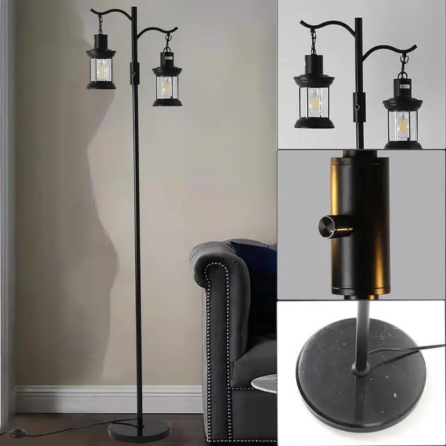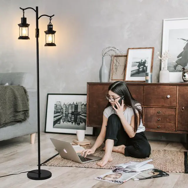 Retro DesignThe black farmhuse floor lamp is hung with two retro glass lampshades with different heights. 2 lights of this farmhouse tree standing lamp lie in 90°vertical separately, provide a 360° stable lighting, you can fully enjoy the comfortable soft warm ambience under the light