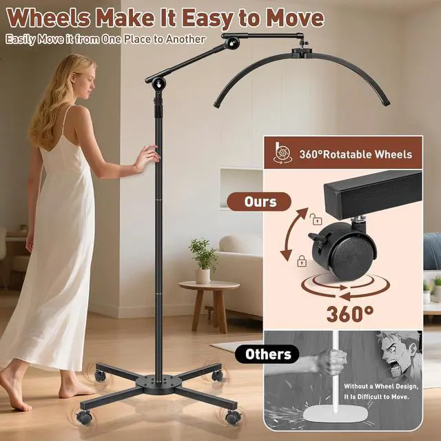 Height-Adjustable Telescopic Half Moon Light This lash light for eyelash tech offers an adjustable height range of 39 to 85 inches, ensuring optimal comfort for working Location. Whether sitting or standing, you can easily tailor the height to meet your professional needs for eyelash extensions, makeup