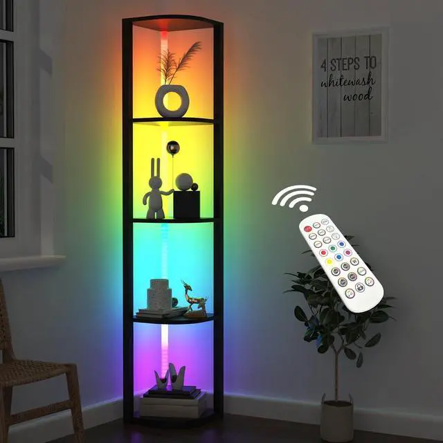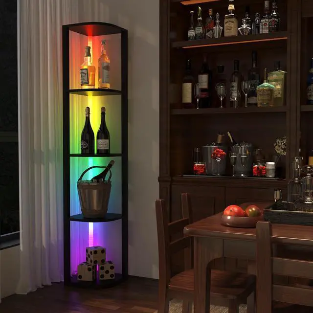 Creative 5-tier Corner Shelf with LightsAfter years of research, development and improvement, we have launched this latest exclusive design and patented corner shelf with Lights, which uses high-quality RGB led strips and is made of high-quality wood material. The panels are sturdy and durable, each level can hold 15 lbs. Upgraded tightening screw patented design makes this product more stable. Our corner shelf that doesn' t take up much space can make a huge difference in your home.