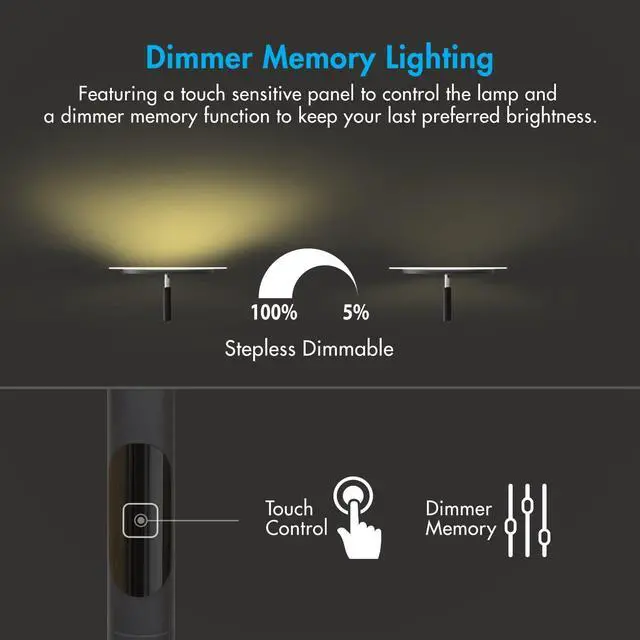 Touch sensitive dimmer memory - A single tap on the touch sensitive LED Torchiere will turn the lamp on/another single tap for off. With a stepless dimming design, holding down on the touch sensor will adjust the lighting gradually to suit your needs. Once youve set a comfortable brightness level, the built in memory function will keep that for you even when turned off.