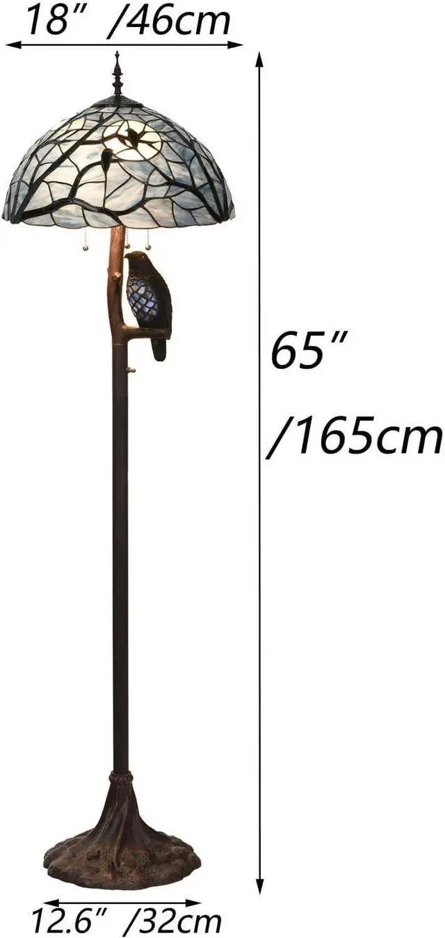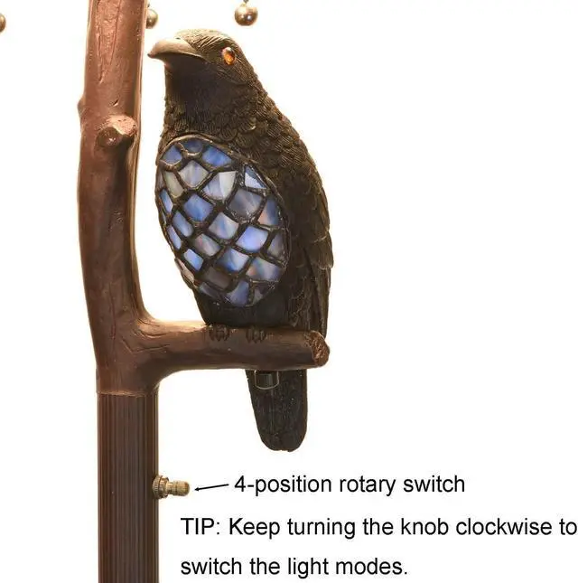 SIZE: 18-inches wide lampshade, 65-inches Tall, 3 x E26 bulb (not included) + 1 x E12 bulb (included), there are 3 x pull-chain switches to control the bulbs under the shade, 1 x 4-position rotary switch (turns clockwise) to control the owl and bulbs on and off separately, and 1 x foot switch to control all the bulbs on and off., we are using a warm white light bulb for taking the photo. You can try the bulbs with different color temperatures to get different light effects.