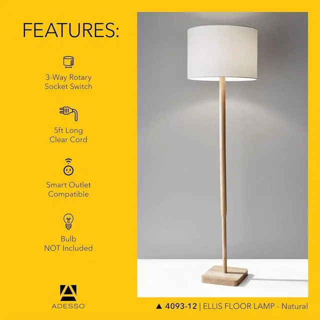 Versatile Style Minimalist floor lamp features a natural rubberwood finish base and a white textured linen drum shade. Timeless design complements a wide range of home decor stylesperfect for modern, farmhouse, rustic, midcentury, or boho decor.