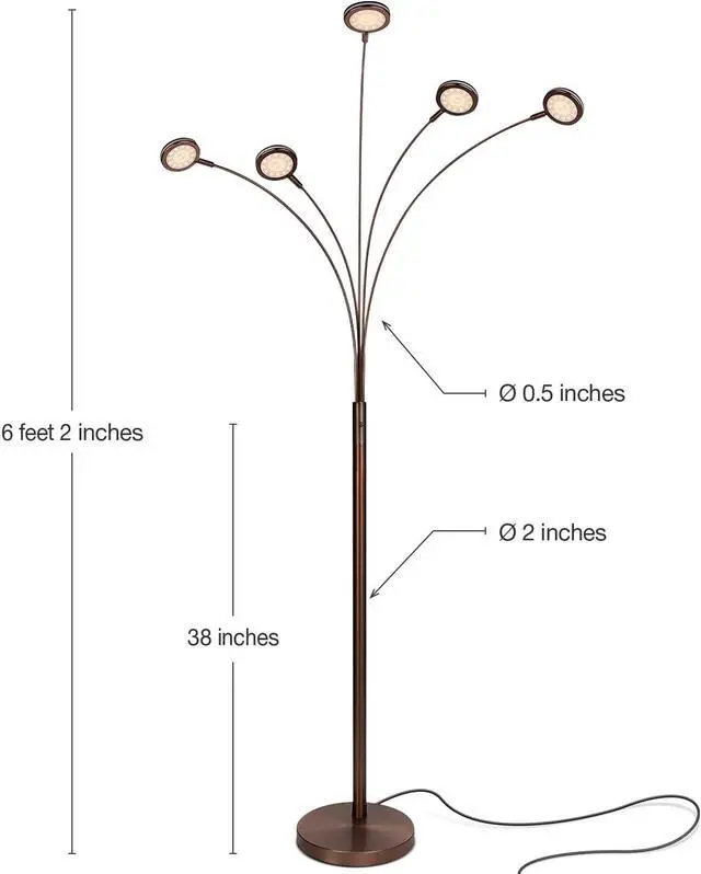 Brilliant LED Lighting - Brightech' s arched floor lamp with built-in rotating LED light has 2250 Lumens (450 X 5 heads) enough to light your entire living room and bedroom. The Brightech Orion tree floor lamp gives you brightness like a 200-watt halogen lamp and the lamp generates 3000K warm white colors. Whether you want to read, write, or simply relaxthe standing lamp provides ample illumination without straining the eyes.