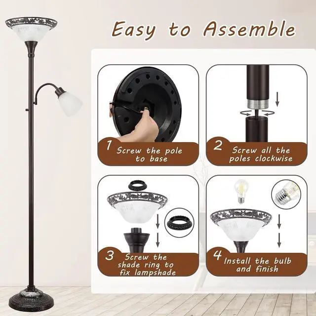 Stable & Weighted Metal Base - Heavy-duty metal stem and thick torchiere glass shade prevent tipping, safe for homes with kids, elders, or pets.